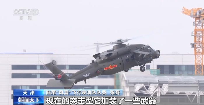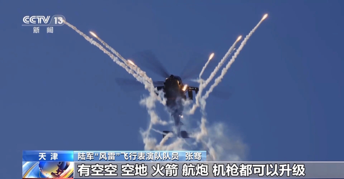 陆军“风雷”飞行表演队队员 张骞:可以挂载更多武器,有空空、空地、火箭、航炮、机枪都可以升级,而且它挂载副油箱之后,作战半径也增加了。