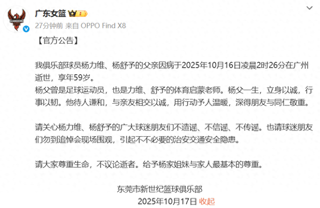 10月17日,@广东女篮 发文悼念杨力维、杨舒予父亲: