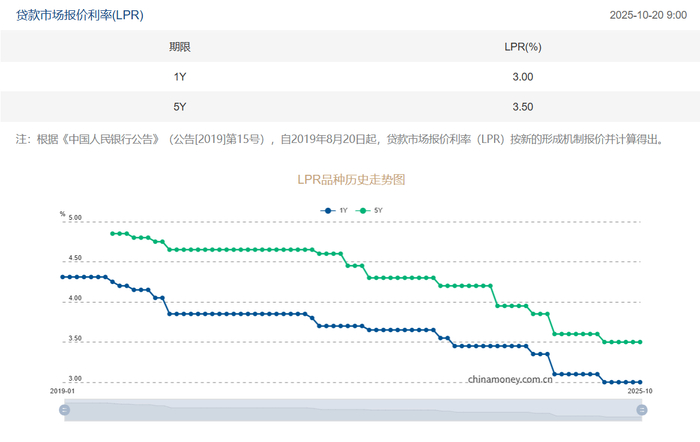 中国人民银行授权全国银行间同业拆借中心公布,2025年10月20日贷款市场报价利率(LPR)为:1年期LPR为3.0%,5年期以上LPR为3.5%。以上LPR在下一次发布LPR之前有效。