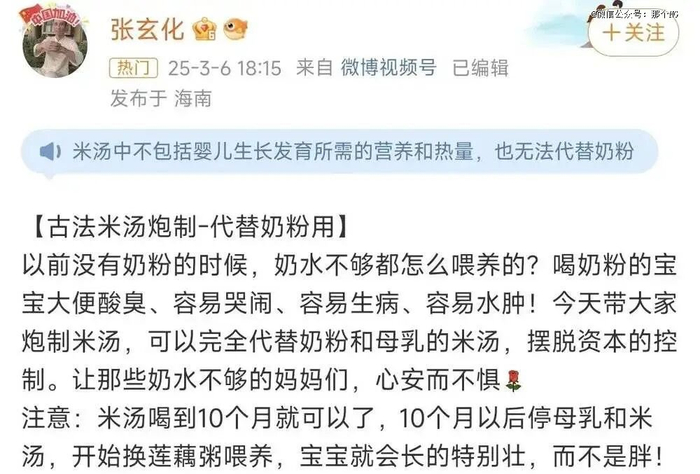 他曾在公开主张“用古法米汤替代奶粉”喂养婴幼儿,摆脱资本控制,孩子不喝奶粉只喝米油,可以长得白又壮。结果后续被扒出来,他的视频背景里摆放着一罐明晃晃的名牌奶粉。
