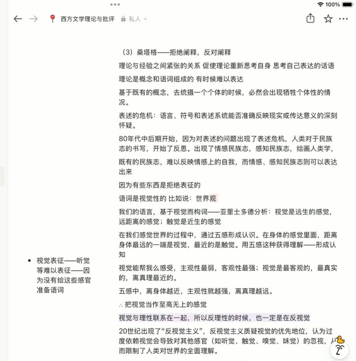 张希希学西方文论时在电脑里做的笔记,她表示,“手写完全跟不上老师的速度”。