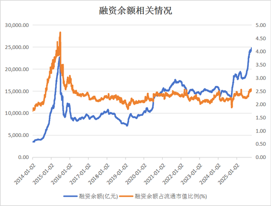 从资金面情况来看,2015年4月10日,彼时A股融资余额为16430.73亿元,融资余额占流通市值比例为3.87%,融资买入额占A股成交额比例为15.12%。2025年10月28日,A股融资余额为24769.91亿元,创历史新高,但融资余额占流通市值比例为2.53%,融资买入额占A股成交额比例为11.93%,融资余额占流通市值比例和融资买入额占A股成交额比例并未到达高点。