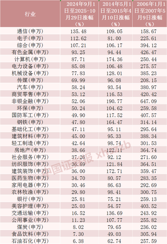 从领涨板块情况来看,在本轮行情中,2024年9月1日—2025年10月29日,通信、电子、综合行业领涨市场,分别累计上涨135.48%、112.62%、107.21%,有色金属、计算机、电力设备行业均涨逾80%。