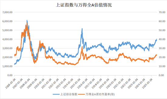 从市场估值情况来看,截至10月29日收盘,万得全A滚动市盈率为22.66倍,市净率为1.87倍;2015年4月10日,万得全A滚动市盈率为23.63倍,市净率为2.81倍;2007年5月9日,万得全A滚动市盈率为47.32倍,市净率为4.95倍。