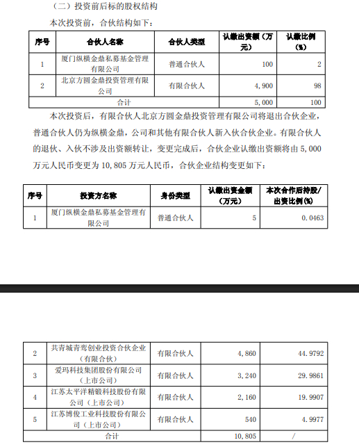 据悉,合伙企业的主营业务以股权投资为主,拟对上海沃兰特航空技术有限责任公司或其未来实际上市主体进行投资。公告还指出:本次投资后,有限合伙人北京方圆金鼎投资管理有限公司将退出合伙企业,普通合伙人仍为纵横金鼎,公司和其他有限合伙人新入伙合伙企业。有限合伙人的退伙、入伙不涉及出资额转让,变更完成后,合伙企业认缴出资额将由5,000万元人民币变更为10,805 万元人民币。