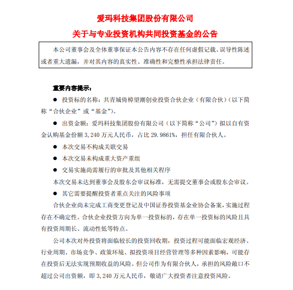 投资界(ID:pedaily2012)10月30日消息,近日,爱玛科技集团股份有限公司发布关于与专业投资机构共同投资基金的公告,宣布拟以自有资金认购基金份额 3,240 万元人民币,共青城倚樟望潮创业投资合伙企业(有限合伙)(以下简称“合伙企业”或“基金”),占比 29.9861%,担任有限合伙人。