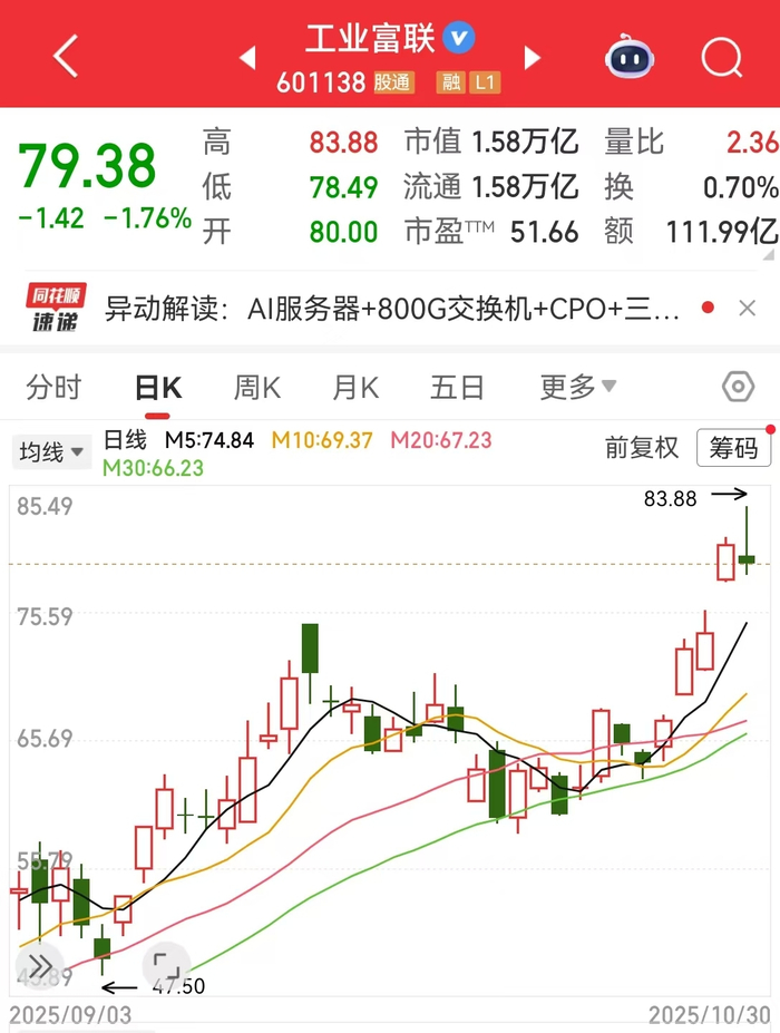 截至发稿,工业富联报79.38元,跌幅1.76%,市值1.58万亿元。