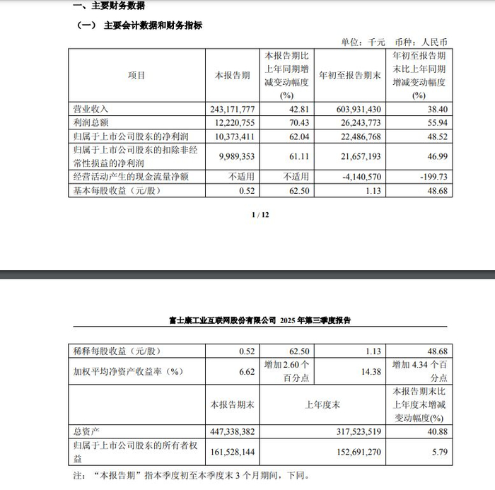 10月29日,工业富联发布2025年第三季度报告。2025年前三季度,该公司实现营收6039.31亿元,同比增长38.4%;归母净利润达224.87亿元,同比增长48.52%。其中,受益于AI业务的强劲增长,该公司第三季度营收达2431.72亿元,同比增长42.81%;归母净利润单季度突破100亿元,达103.73亿元,同比增长62.04%。