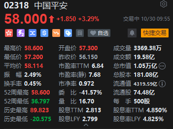 10月30日消息,中国平安港股盘初走强,一度拉升涨超4%,报58.6港元,股价创2021年7月以来新高。