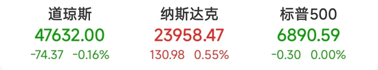 在鲍威尔讲话期间,美股三大指数全线跳水,盘中一度集体翻绿,随后纳指转涨,道指、标普500指数尾盘跌幅有所收窄,截至收盘,道指跌74.37点,跌幅为0.16%,报47632.00点;纳指涨130.98点,涨幅为0.55%,报23958.47点;标普500指数跌0.30点,报6890.59点。