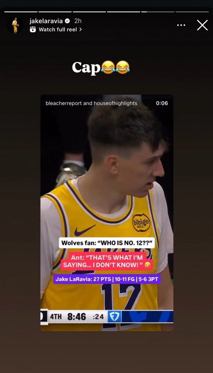 值得一提的是,湖人侧翼拉拉维亚(12号)赛后在Instagram上转发了相关片段(如下):“撒谎??。”
