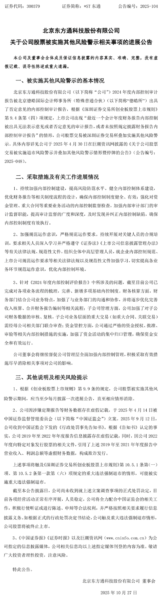 发布三季报季报的当天,*ST东通第六次发布可能被实施重大违法强制退市的风险提示公告。公司表示,由于涉嫌定期报告等财务数据存在虚假记载,公司可能被实施重大违法强制退市。