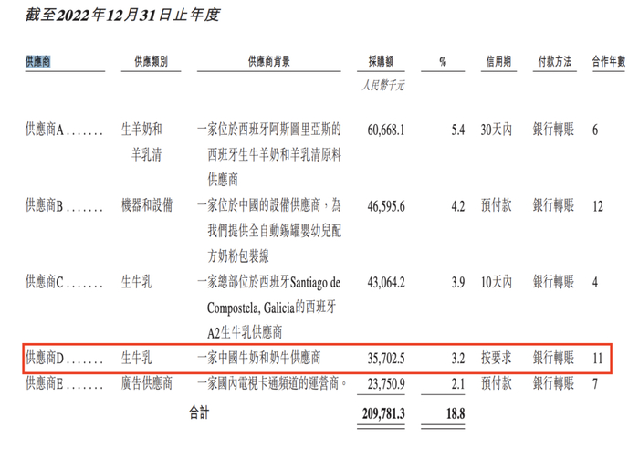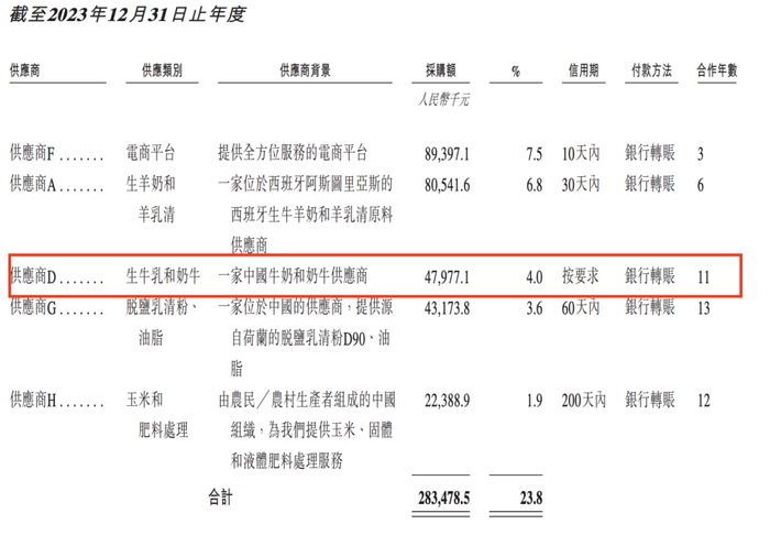 宜品集团与供应商D的合作时间长达11年,2023年其供应类别为“生牛乳和奶牛”,2022年为“生牛乳”。宜品集团2023年向“供应商D”的采购金额为4797.71万元,占当年总采购额的4%;2022年采购额为3570.25万元,占比3.2%。