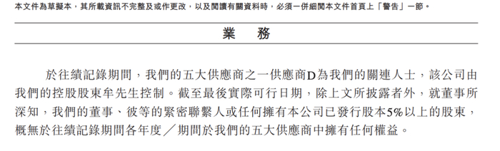 澎湃新闻在招股书中发现,五大供应商之一的供应商D为关连人士,该公司由宜品集团的控股股东牟善波控制。