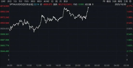 在昨日下跌后,10月30日国际金价出现拉升走高,截至发稿,现货黄金涨超2%,再度站上4000美元/盎司关口,现货白银也涨超2%。
