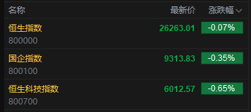 今日港股三大指数集体低开,恒生指数跌0.07%,报26263.01点,恒生科指跌0.65%,国企指数跌0.35%。盘面上,科网股跌多涨少,网易、小米、百度、阿里巴巴跌超1%;中资券商股多数上涨,招商证券涨超1%;黄金股活跃,赤峰黄金涨超2%;汽车股走弱,比亚迪跌超3%。