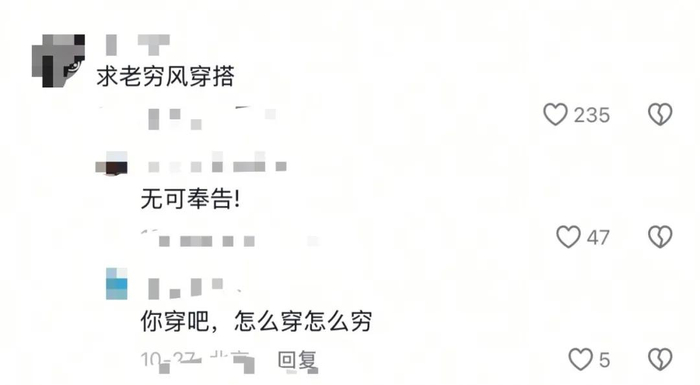北漂PP自诩老穷风资深玩家,在他看来,老钱风是“不显山露水的贵气”,老穷风就是“坦坦荡荡的穷感”。“以前穷还要装阔,现在直接说‘我没钱’,反而能堵住所有人的嘴。”