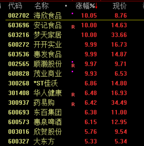 大消费板块表现活跃,茂业商业、惠发食品等涨停。