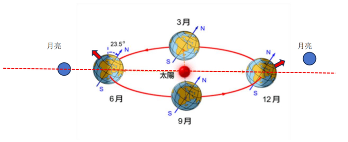 ▲图中蓝色小球代表月亮,红色箭头代表地球上某纬度处的观察者,在冬季(图中12月处,看到的月亮最高点比较高),在夏季(图中6月处,看到的月亮最高点比较低)。受访者供图