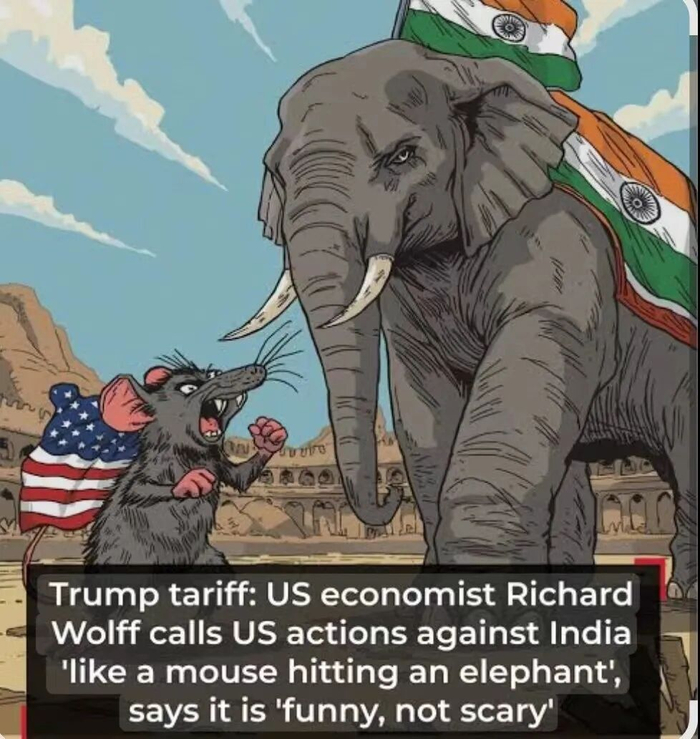 哦,我看到,有人还专门画了一张漫画,引述美国经济学家的说法,美国对印度的关税,就像“老鼠打大象”,“很有趣,但不吓人”。