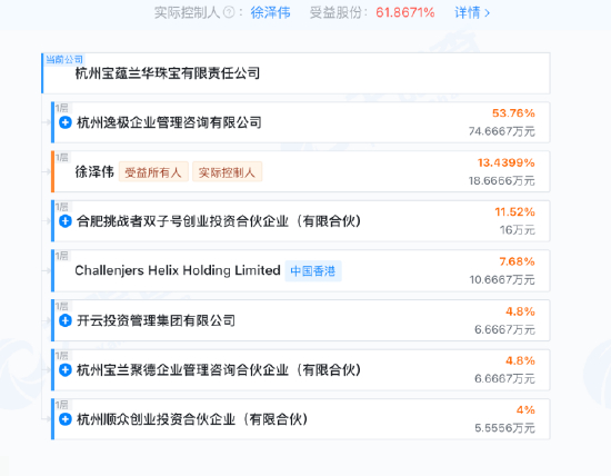 ‌此外,徐泽伟还担任新成立的融资主体杭州宝蕴兰华珠宝有限责任公司的董事长,该公司在今年8月28日注册,注册资本为138.88万元,徐泽伟在该公司担任董事长及法定代表人,并持有约60% 的股份。这一架构也表明,徐泽伟或已全面掌舵寶蘭品牌的现有业务与未来资本化发展。