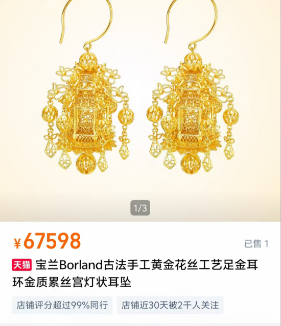 经《贵圈》栏目测算,寶蘭多款产品的单克售价已逼近甚至超过2000元人民币。以一款重约34克的古法手工黄金花丝工艺足金宫灯耳坠为例,其售价高达67598元,经折算其单克价格约为1988元;一款65.14克的古法工艺足金累丝手镯,售价更是达到125718元,经折算其单克价格约为1930元。即便以近期约1328元/克的常规金价为基准计算,其品牌溢价率也已达到50%以上。