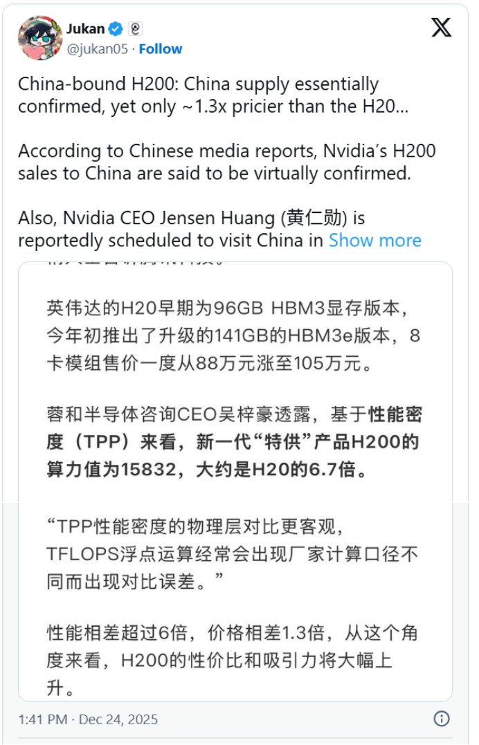 此前特朗普政府放宽了英伟达H200人工智能芯片对华出口限制,但考虑到中国正积极推动技术供应链国产化转型,业内曾普遍质疑中国市场是否会采购这款新芯片。此外,尽管英伟达曾承诺向中国市场推出基于Blackwell架构的产品,最终却再度引入Hopper架构的芯片,这也让外界对H200的市场需求前景持怀疑态度。不过,分析师jukan援引中国本土消息源称,英伟达计划以极具吸引力的定价打破这一困局,促使客户难以拒绝。