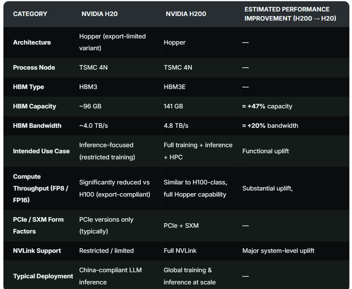 媒体透露,一套由8H200芯片组成的集群方案,定价约为20万美元,与同等配置的H20集群价格基本持平。更值得关注的是,H200芯片的规格实现了大幅升级,据测算其性能较H20提升超6倍。凭借这一性价比优势,尽管H2002024年第四季度才正式推出,英伟达仍有望使其成为中国市场的热门之选。以下是H200H20的核心纸面规格对比:
