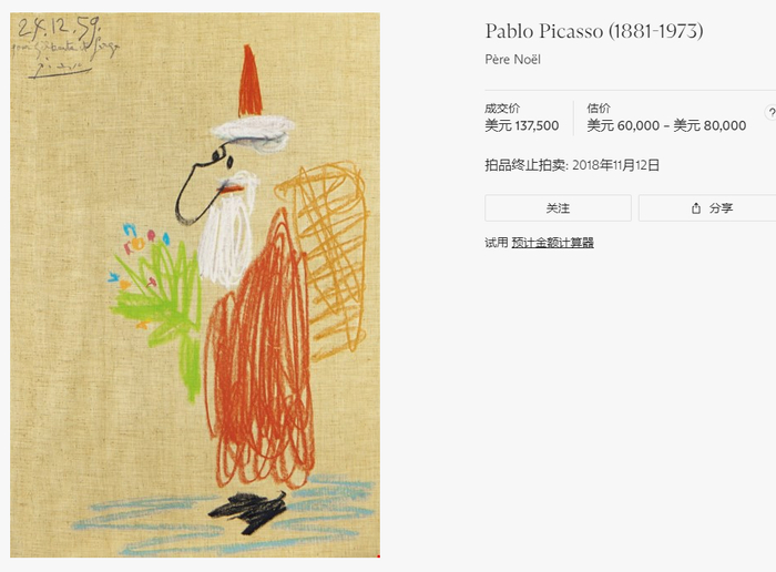 值得一提的是,照片背景中的挂画是毕加索在1959年创作的画作。查询发现,该画作在2018年底拍卖,当时的成交价格是137500美元(折合人民币约96.3万元)。