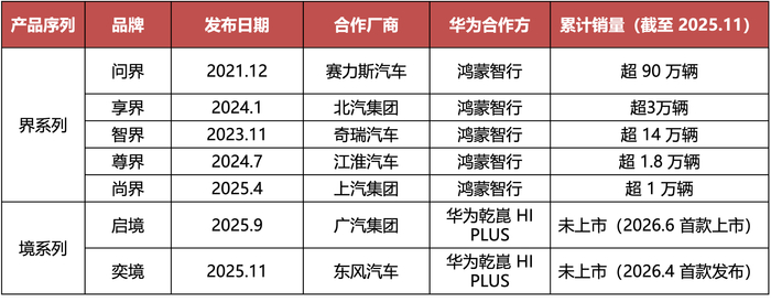 其中,鸿蒙智行模式为“五界”品牌所采用,是HI模式的升级版,也是目前华为参与度最高的合作方式。华为深度介入产品定义、设计研发与渠道销售,与合作车企形成“联合创业”的共生关系。截至2025年11月20日,鸿蒙智行全系车型累计交付量突破100万辆。