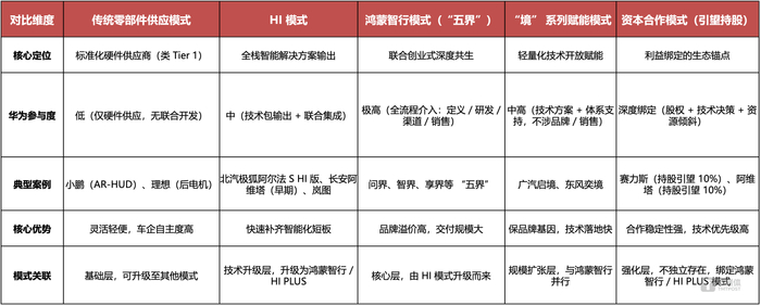 从零部件供应、HI模式,到深度共创的“界”系列、轻量赋能的“境”系列,再到资本绑定的“引望模式”, 这种多线并进的策略,就像是又一次存在在华为组织基因中的“赛马文化”的落地。
