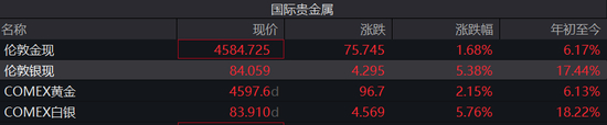 白银同步飙升。白银现货站上84美元/盎司,涨幅超5.5%,再创历史新高。截至发稿,伦敦银现报84.059美元/盎司,日内涨5.38%,年初至今已涨17.44%;COMEX白银报83.91美元/盎司,日内涨5.576%,年初至今已涨18.22%。