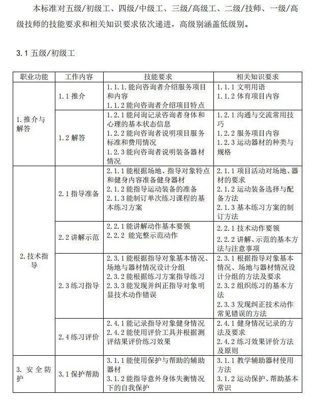 《社会体育指导员国家职业技能标准(修订版)》中社会体育指导员(五级/初级工)工作要求