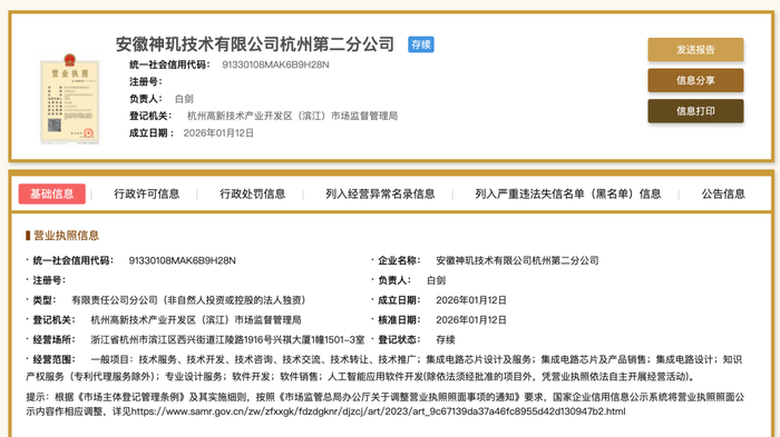 最新公开工商信息显示,蔚来全资芯片子公司安徽神玑,最近在杭州滨江区注册了第一、第二分公司,从事芯片设计和销售、软件开发和销售等业务。