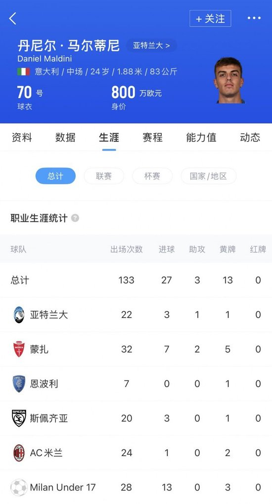 丹尼尔·马尔蒂尼现年24岁,德转身价800万欧。本赛季代表亚特兰大出场11次376分钟,送出1次助攻。
