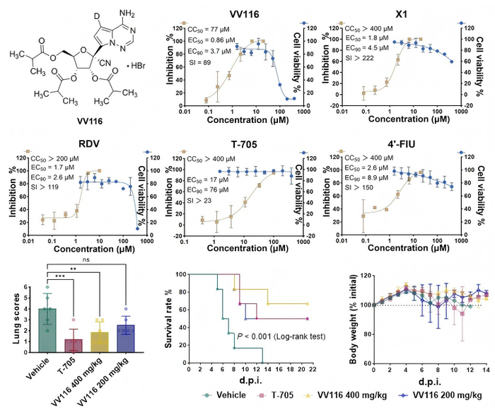 VV116(氢溴酸氘瑞米德韦片)是一种新型口服核苷类抗病毒药物,已先后在乌兹别克斯坦和中国获批上市用于新冠肺炎的治疗。本研究发现,作为一种靶向病毒RNA依赖性RNA聚合酶(RdRp)的前药,体外实验中VV116和其代谢活性分子均展示了对尼帕病毒(包括马来西亚株NiV-M和孟加拉株NiV-B)的显著抑制活性。在金黄地鼠致死剂量感染模型中,VV116以400毫克每千克体重的口服给药剂量下,能将实验动物的存活率提高至66.7%,且显著降低感染靶器官肺、脾和脑中的病毒载量。