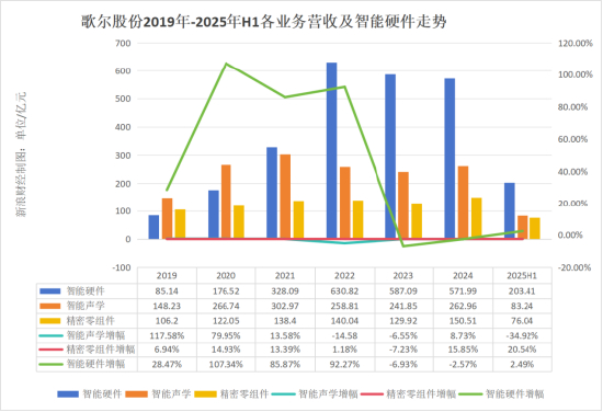 进入2023年,歌尔智能硬件业务的营收开始出现了明显下滑,由上一年的同比增长92.27%,变为下跌6.93%,随后2024年下跌2.57%,至2025年上半年,仅保持2.49%微弱增长。