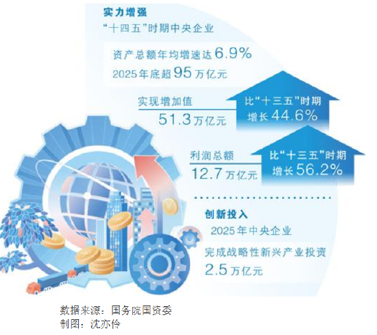 2025年,中央企业实现利润总额2.5万亿元,完成固定资产投资5.1万亿元,上交税费2.5万亿元。截至2025年底,中央企业资产总额突破95万亿元。