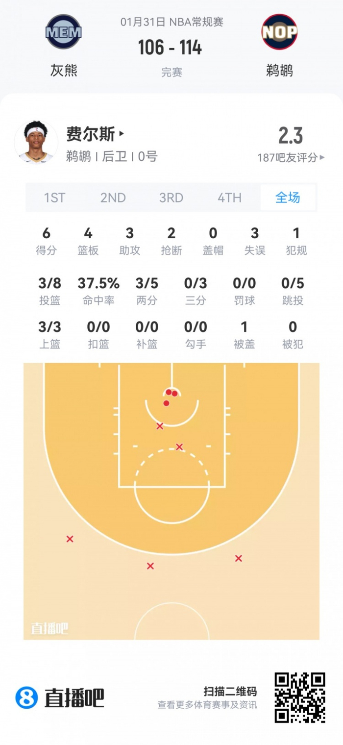鹈鹕首轮7号秀费尔斯 登场16.9分钟
