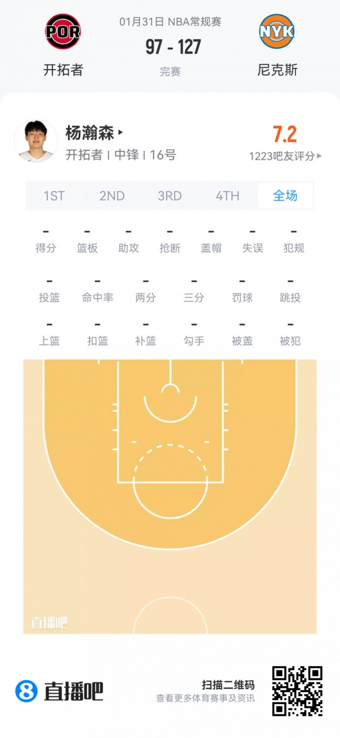 开拓者首轮16号秀杨瀚森 登场4.1分钟