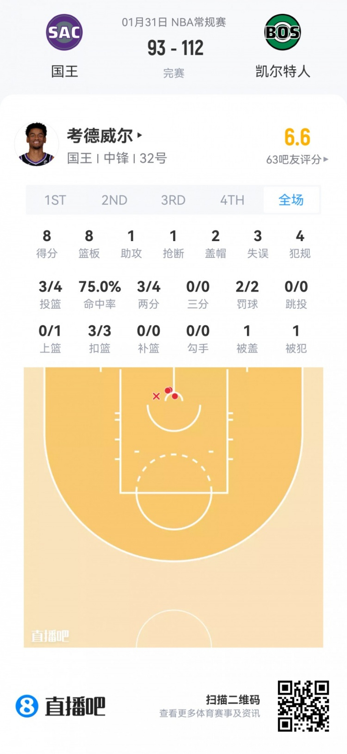 国王落选秀迪伦·考德威尔 登场27.6分钟
