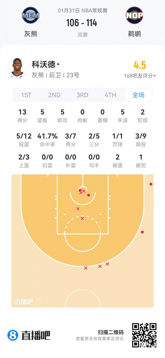 灰熊首轮11号秀科沃德 登场23.5分钟