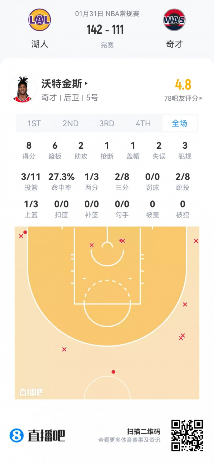 奇才次轮43号秀沃特金斯 登场34.8分钟