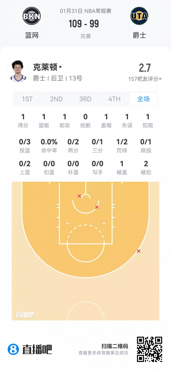 爵士首轮18号秀克莱顿 登场13.1分钟