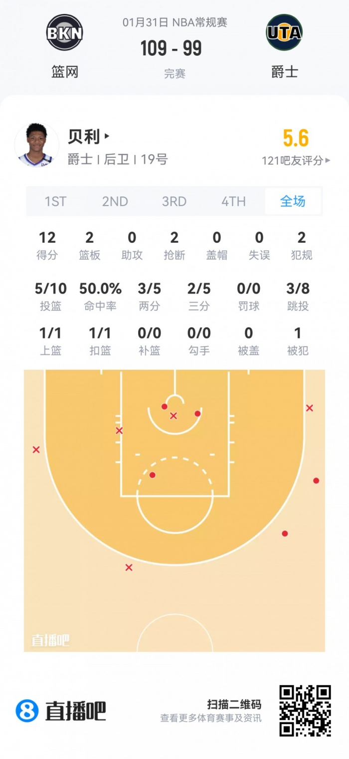 爵士首轮5号秀埃斯·贝利 登场29.3分钟