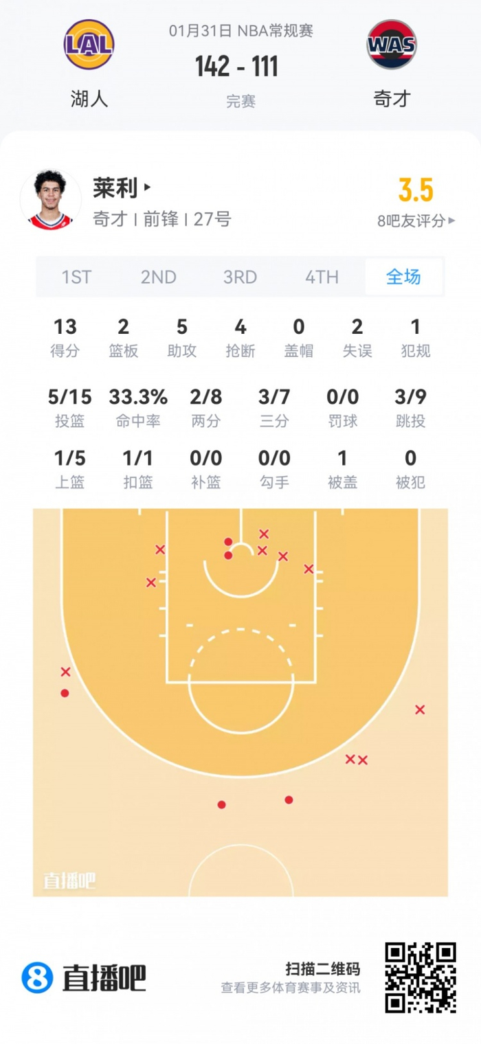 奇才首轮21号秀威尔·莱利 登场24.9分钟