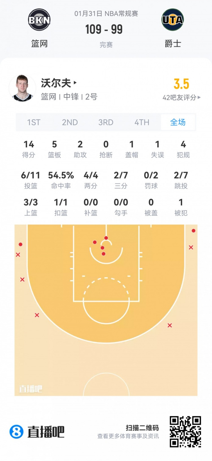 篮网首轮27号秀沃尔夫 登场28.5分钟