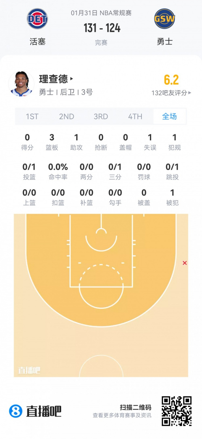 勇士次轮56号秀威尔·理查德 登场15分钟