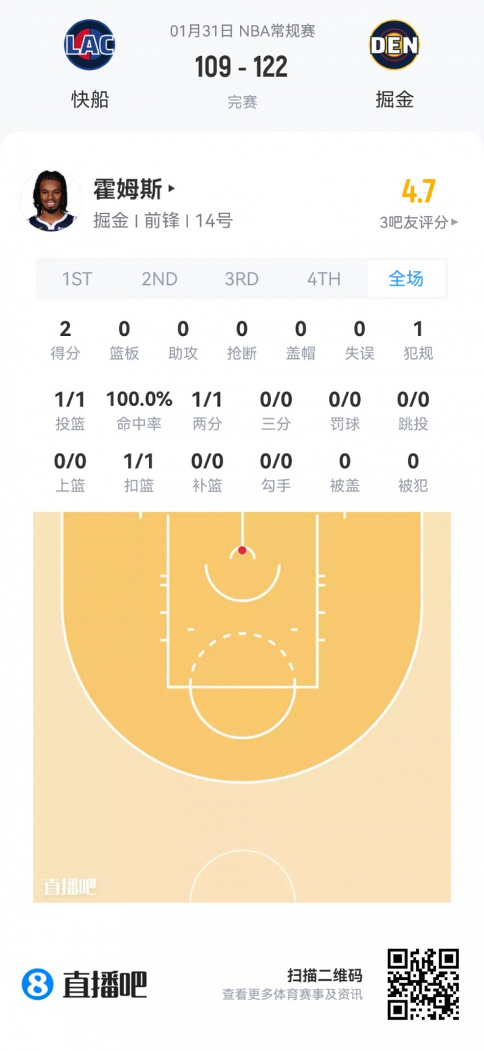 掘金24年首轮22号秀达龙·霍姆斯二世 登场2分钟