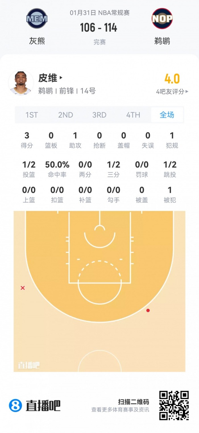鹈鹕次轮40号秀米卡·皮维 登场7.3分钟